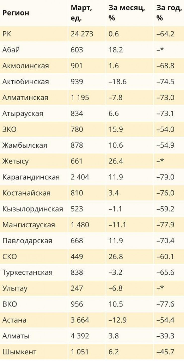 Как сообщает Бюро нацстатистики, максимальный рост по сравнению с февралем произошел в СКО (+26,8 процента), в областях Жетысу (+26,4 процента) и Абай (+18,2 процента). Наибольшее снижение - в Актюбинской области (-18,6 процента), в Астане (-12,9 процента) и Мангистауской области (-11,1 процента).