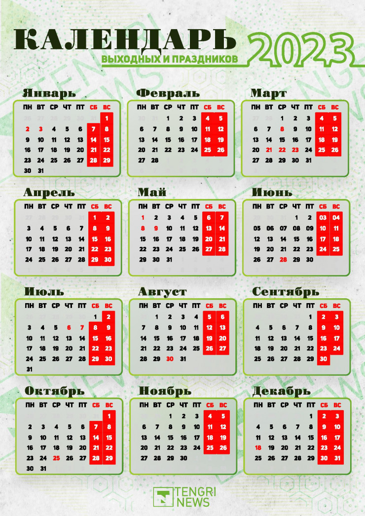 В предстоящем году казахстанцев с пятидневной рабочей неделей ждут 245 рабочих и 120 выходных дней. Для вашего удобства Tengrinews.kz собрал все праздничные и выходные дни, а также дни переноса выходных из-за праздников в удобный календарь на 2023 год.