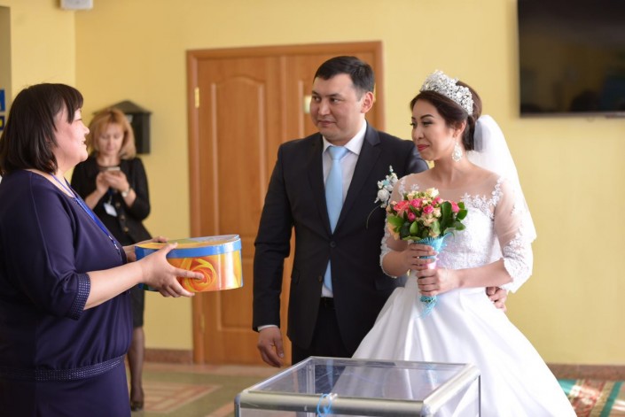 В Астане выполнить гражданский долг на избирательный участок приехали молодожены.