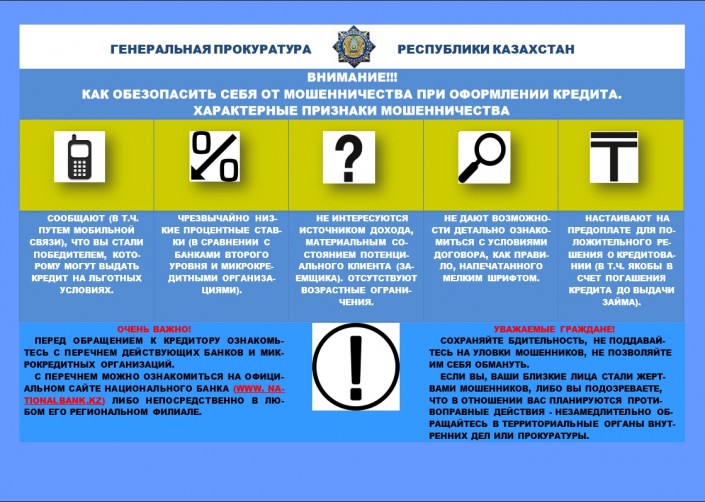 "Подобного рода предложения должны насторожить вас, прежде всего будьте благоразумными. Оградить себя от мошенников предельно просто. С перечнем официально действующих банков второго уровня и микрокредитных организаций, оказывающих услуги по кредитованию, а также принимающих вклады, можно ознакомиться на официальном интернет-ресурсе Национального банка РК (nationalbank.kz)", - говорится в сообщении прокуратуры.