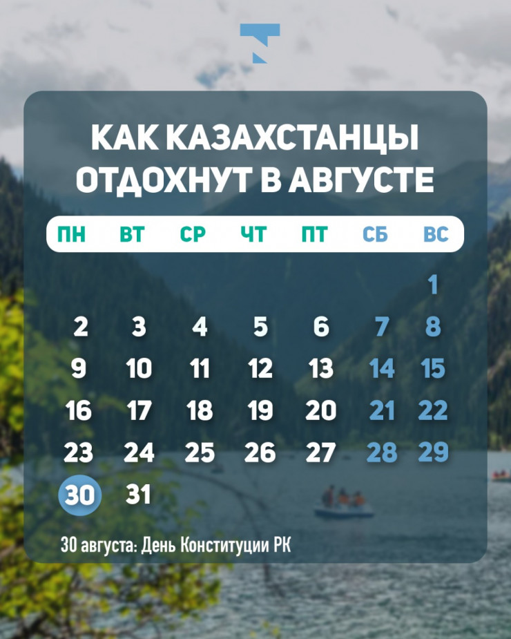 30 августа в стране отмечается День Конституции. Единственный государственный праздник этого месяца выпадает на понедельник. Это значит, что при пятидневной рабочей неделе казахстанцы отдохнут три дня подряд - с 28 по 30 августа.