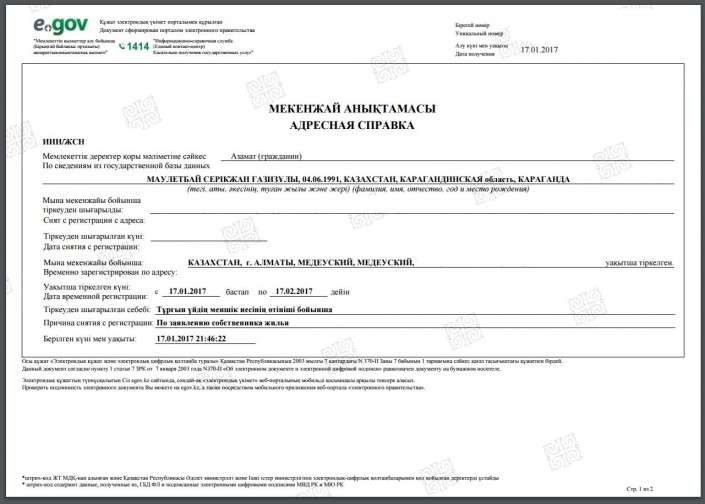Лично проверить результат регистрации по месту жительства можно, запросив через Egov.kz адресную справку. Услугу можно также получить в разделе "Гражданство, миграция и иммиграция". В результате, в документе у лиц, у которых уже имеется регистрация по месту жительства, будет указан адрес места жительства и адрес временной регистрации. Также будет указана дата временной регистрации с двумя числами - днем начала и днем окончания.