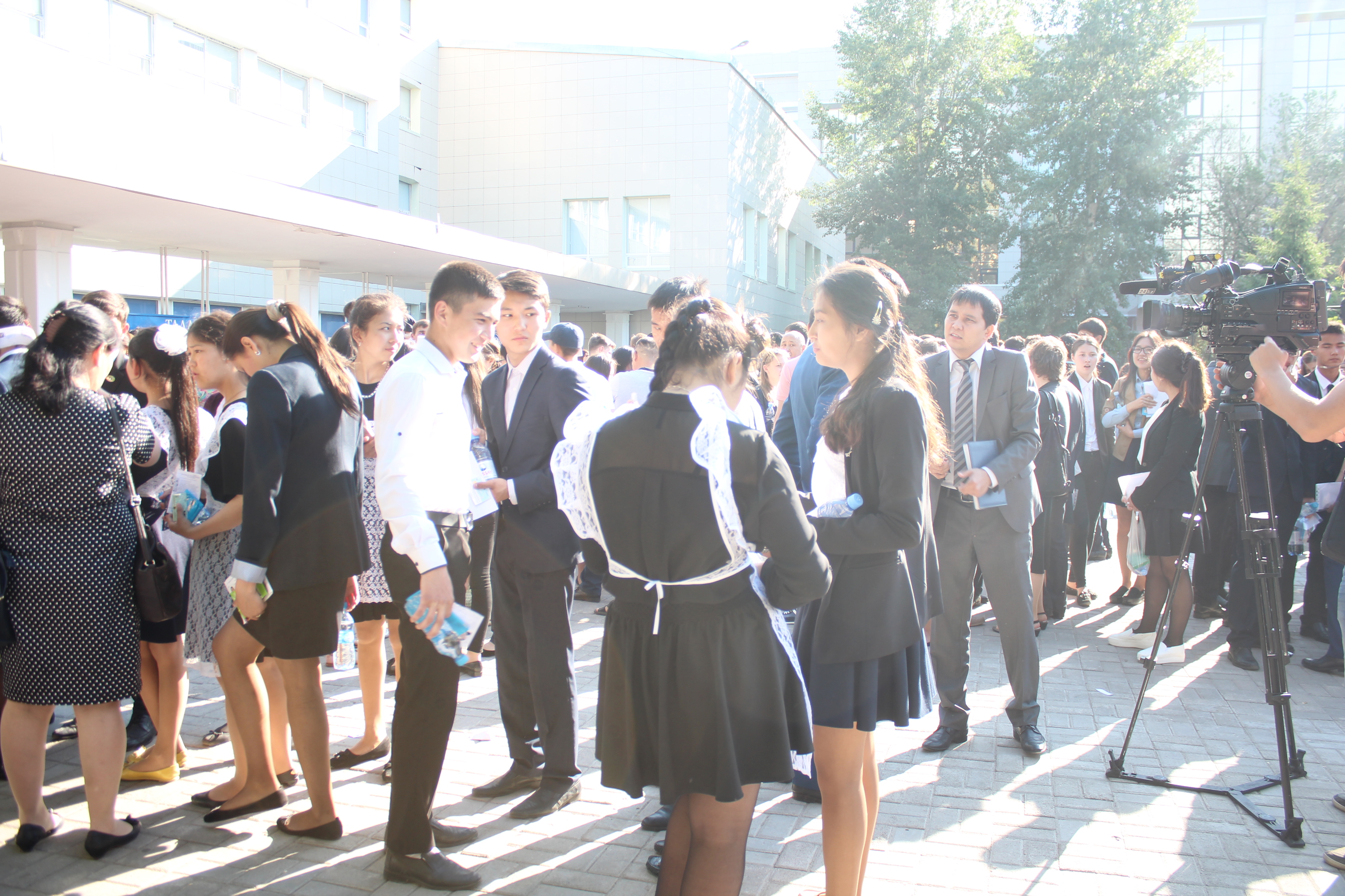 Выпускники возле корпуса ЕНУ - с 7.30 утра. Сам экзамен начинается в 09.30. Они немного волнуются, порой нервно смеются, вспоминают вопросы, которые еще перед сном старательно повторяли.