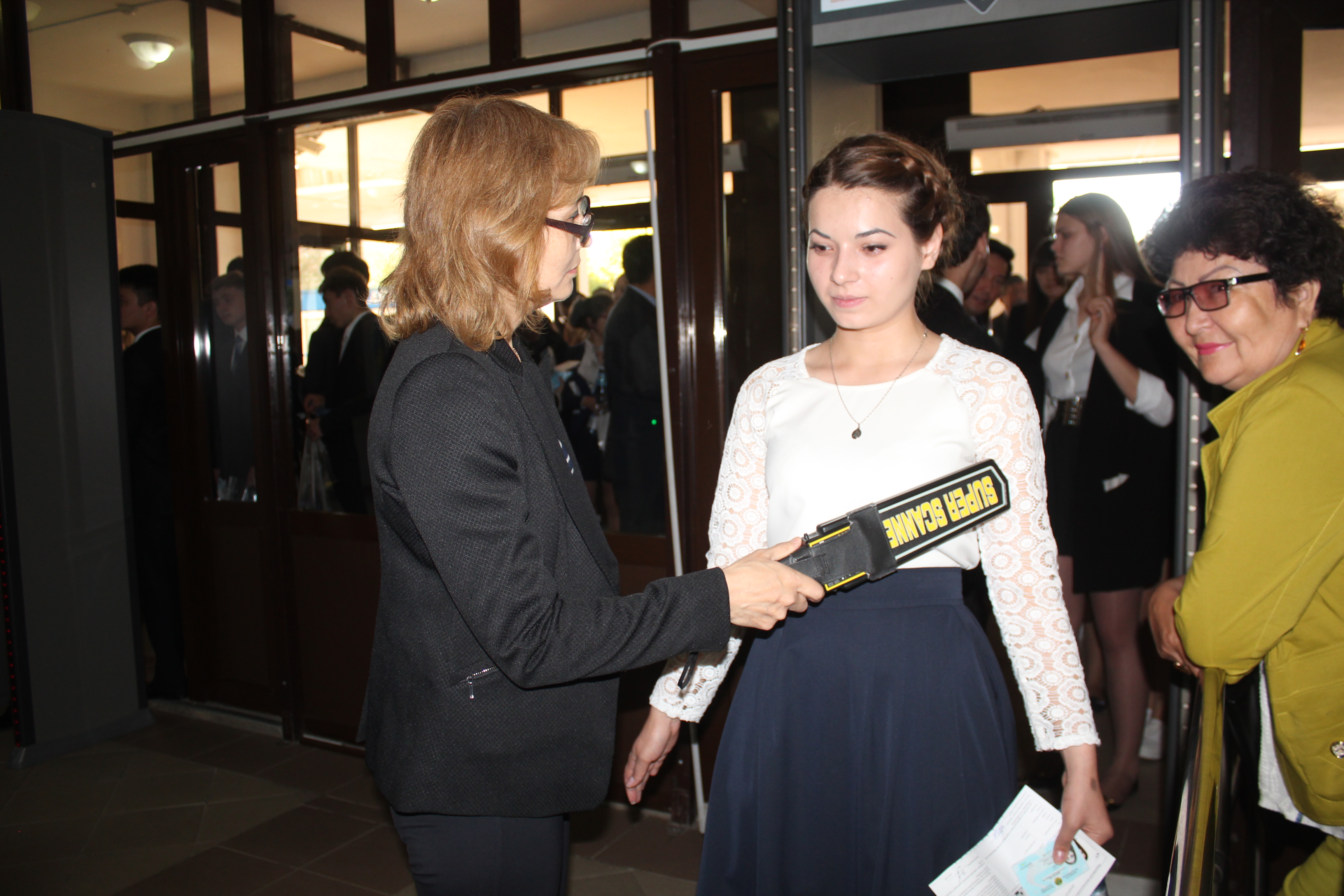Все лишнее, по мнению комиссии, забирают на входе. Выпускники проходят несколько досмотров. Как поясняют сотрудники Министерства, выпускниц проверяют представительницы слабого пола, выпускников - мужчины.