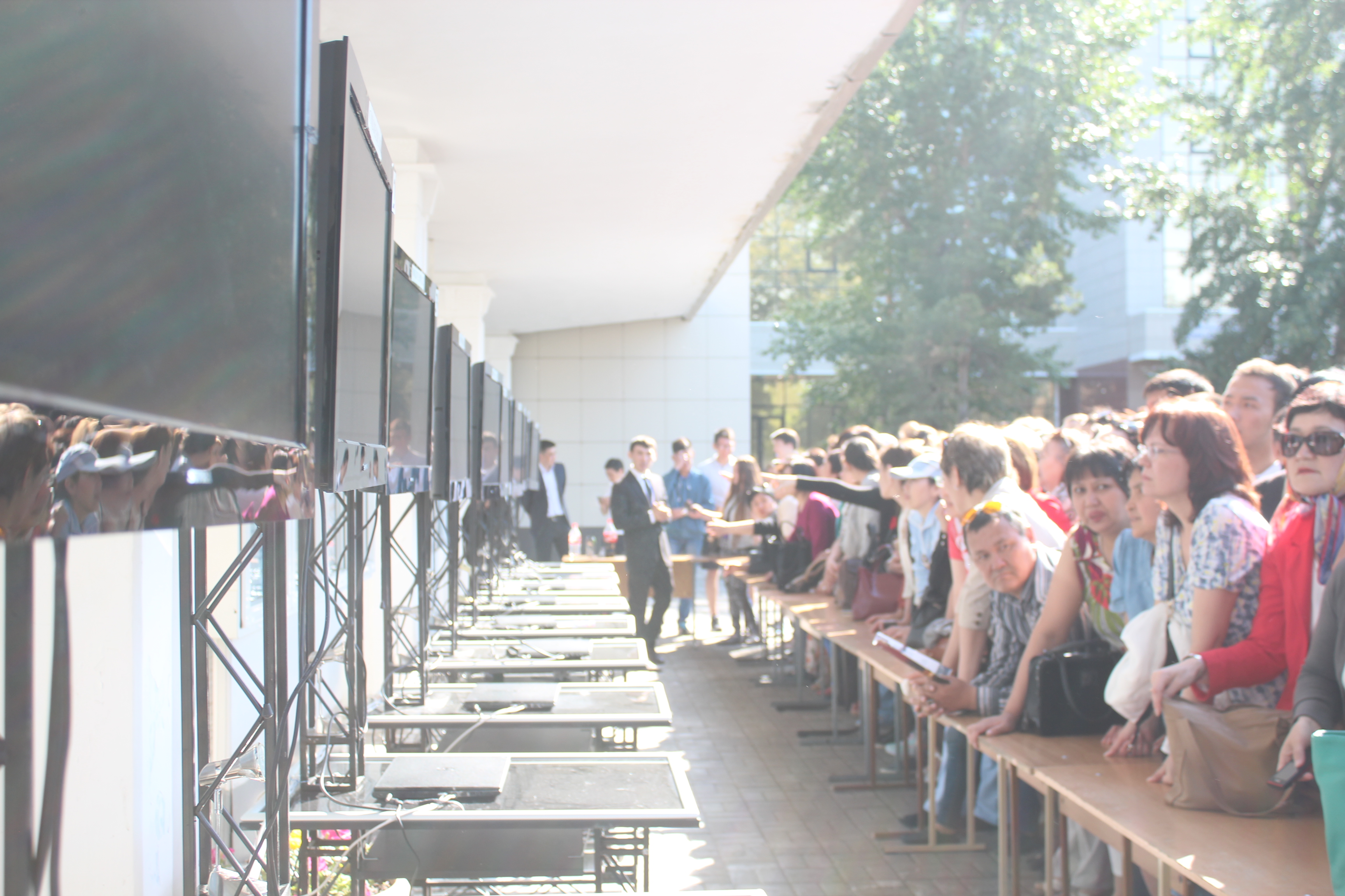 У входа в здание установлены мониторы. Родители, родственники выпускников в режиме онлайн наблюдают за тем, как дети сдают экзамен.