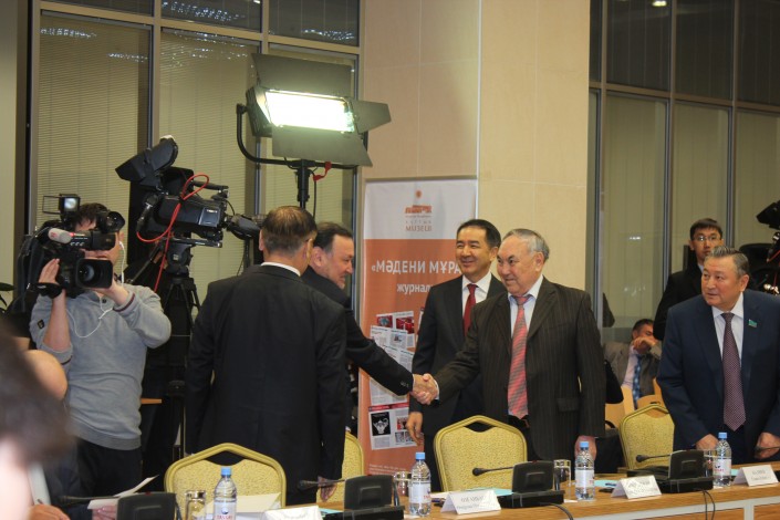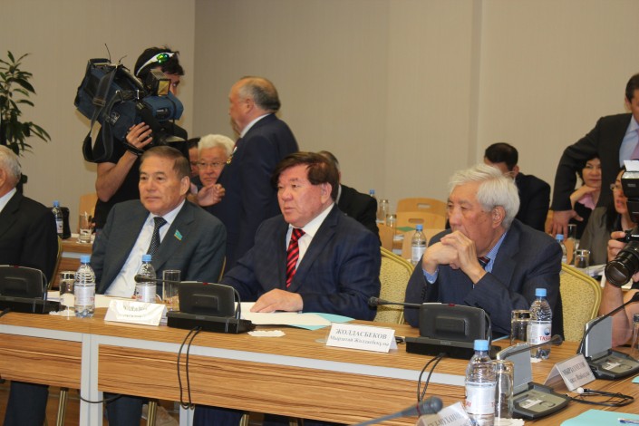 Депутат Сената Парламента Куаныш Айтаханов, главный редактор журнала "Жалын" Мухтар Шаханов, общественный деятель, академик Национальной академии наук Мырзатай Жолдасбеков.