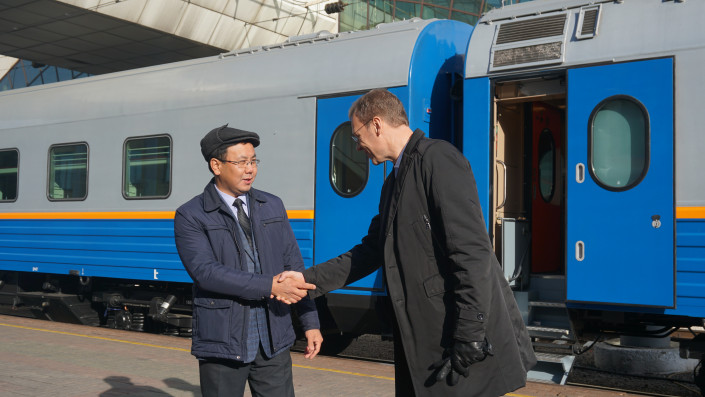 На станции Нур-Султан-1 генеральный директор АО "Пассажирские перевозки" Михаэль Кортюм и директор по производству ТОО "Тулпар-Тальго" Рамазан Тлеуленов провели презентацию новых вагонов.