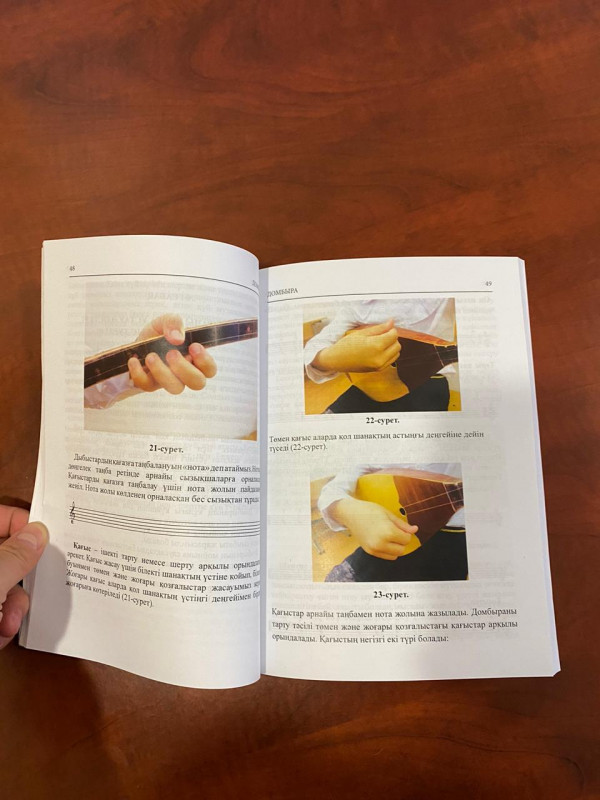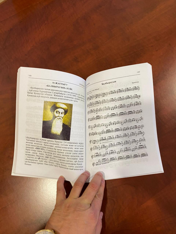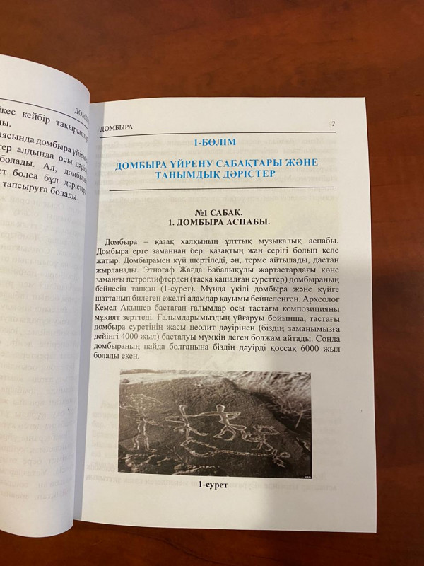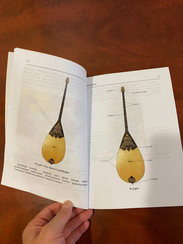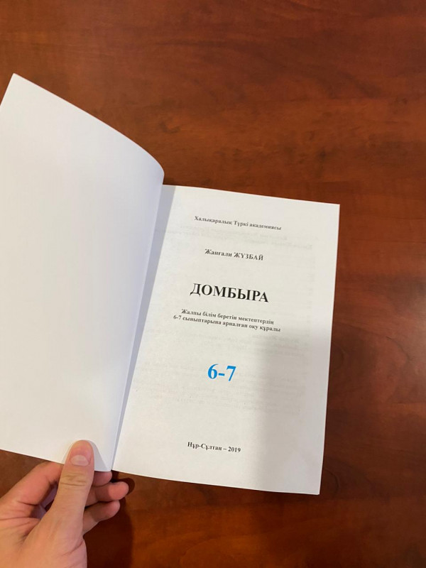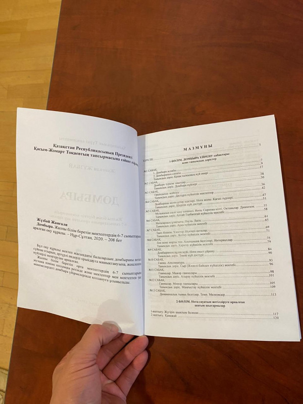 Автор учебника - музыкант-виртуоз Жангали Жузбай. Это только первая версия учебника, которая не тиражировалась. Ранее Международной тюркской академии было дано поручение подготовить учебник "Домбыра". Сегодня Президенту показали первую книгу.