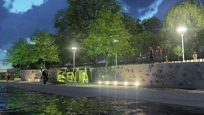 Проект преобразования жилищно-гражданских объектов по набережной реки Есентай (от проспекта Абая до улицы Толе би). Участок -1,4 километра. Площадь территории - 56,14 гектара. Площадь озеленения - 28 094 квадратных метра. Планируется строительство насосных станций, фонтанов, спусков к реке, переходных мостов, пандусов и детских площадок.