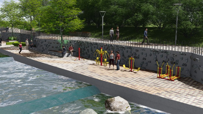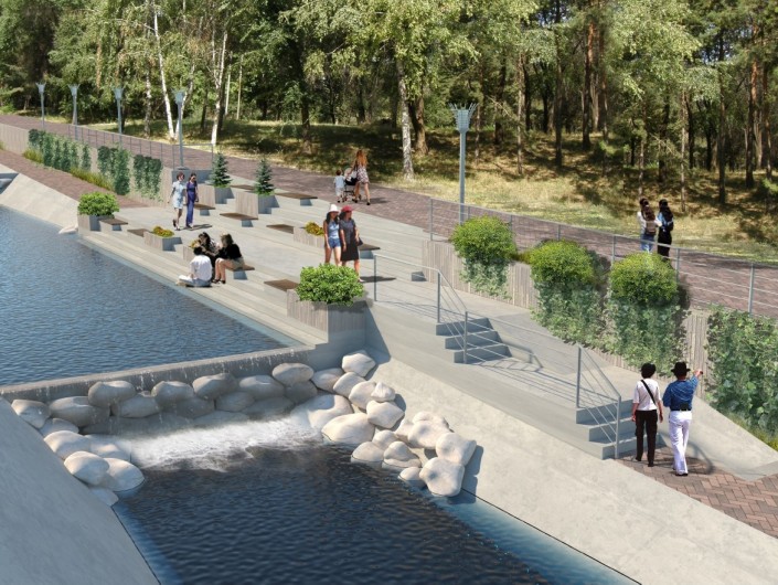 Планируются расширение существующих и устройство новых пешеходных дорожек и аллей на обоих берегах, устройство площадок для отдыха с установкой детских игровых и спортивных комплексов, в том числе инклюзивных. Предусмотрены спуски к воде, на отдельных участках русла реки предлагается заменить бетонные "запруды" на специально подобранные валуны. Запроектирован сухой фонтан. На пешеходных аллеях установят светильники торшерного типа, также встроенная подсветка появится у зеленых насаждений и водной глади.