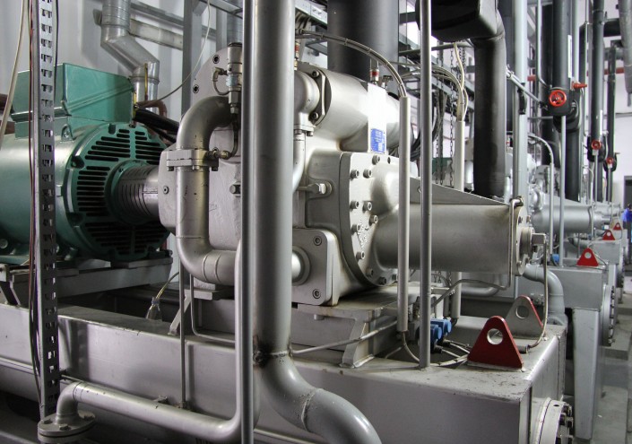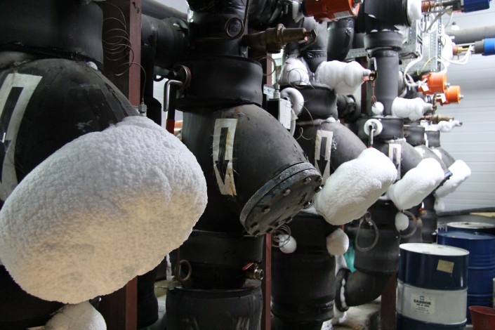 В машинном зале находится станция, которая охлаждает лед для высокогорного катка. За ночь морозильное оборудование, которое располагается в двух больших павильонах, успевает полностью выработать лед на следующий день. Стоит подчеркнуть, что в данное помещение пропуск имеют только инженеры.