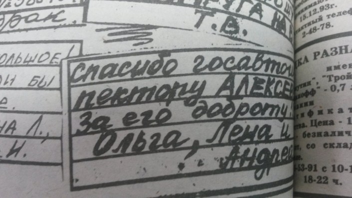 "Спасибо госавтоинспектору Алексею за его доброту. Ольга, Лена и Андрей". А кто-то выражал благодарность лор-врачу первой городской больницы Фасиеву Рифкату Галиевичу.