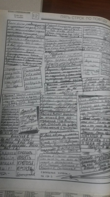 На обмен сообщениями в газете была выделена полоса, где акмолинцы могли оставлять благодарности и признания в любви. В рубрике "Пять строк по поводу" можно было увидеть самые разные пожелания и признания. Написанные пожелания сканировали и собирали на одной странице, поэтому читатели могли узнать адресованные им сообщения по почерку.