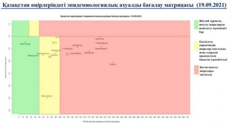 Матрица оценки эпидемиологической ситуации в регионах Казахстана на 19 сентября 2021 года:
