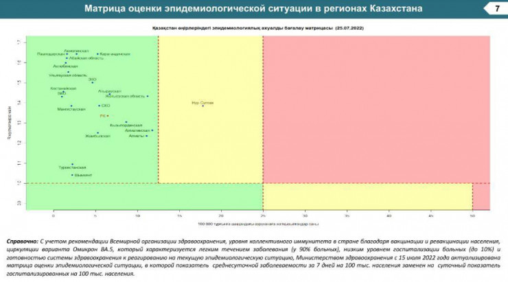 На графике матрицы оценки эпидситуации в Казахстане видно, что Алматинская и Жетысуская области, а также Алматы ближе всех подошли к краю "зеленой" зоны. В Алматы за сутки выявили 532 новых зараженных, а в двух областях - 83 и 84 соответственно.