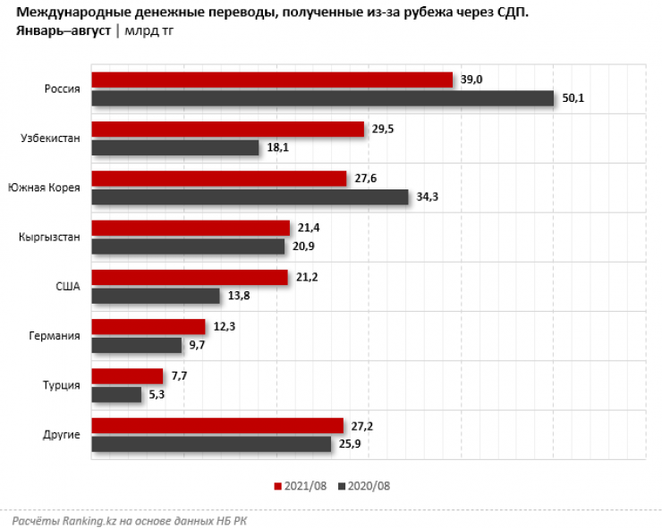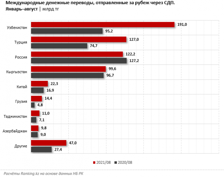 По расчетам аналитиков агентства, сделанным на основе данных Национального банка по системе денежных переводов (СДП), среди стран, в которые чаще всего посылали деньги из Казахстана с начала 2021 года, лидирует Узбекистан. В страну отправили 191 миллиард тенге, что вдвое больше, чем за такой же период прошлого года. Далее в рейтинге идут Турция (127 миллиардов  тенге) и Россия (122,2 миллиарда тенге).