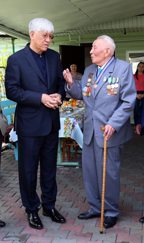 Накануне Дня Победы аким Алматинской области Амандык Баталов поздравил с праздником и с наступающим юбилеем ветерана Великой Отечественной войны и любимого учителя Главы государства Сейитхана Исаева, сообщает корреспондент Tengrinews.kz. Несмотря на свой преклонный возраст, аксакал встретил гостей у порога своего дома и не скрывал своей радости.