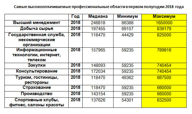 В десятку самых высокооплачиваемых профессий за первое полугодие 2018 года вошли: