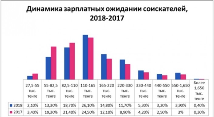 Выше свой труд оценивают 3,2 процента соискателей - они согласны взяться за проекты, если им будут платить от 330 до 440 тысяч тенге в месяц, 3,9 процента - от 550 до 1 миллиона 650 тысяч тенге. 0,4 процента требуют заработную плату выше 1 миллиона 650 тысяч тенге.  В то же время 13,3 процента готовы работать за 55 и 82,5 тысячи, а 2,1 процента готовы довольствоваться 27,5 и 55 тысячами тенге.