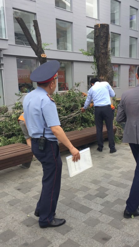 Как уточнили в городской администрации, информация о сносе деревьев на Арбате поступила 12 июля 2018 года. Сотрудники Управления природных ресурсов и регулирования природопользования Алматы, представители природоохранной полиции МПС ДВД Алматы, сотрудники отдела благоустройства и отдела охраны окружающей среды и экологии аппарата акима Алмалинского района выехали на место.