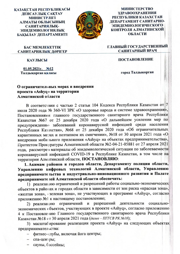 Согласно новым правилам, проект Ashyq масштабируется на объектах предпринимательства области. Среди них фитнес-клубы (включая йога-центры), спа-центры, сауны, бассейны, компьютерные клубы (включая PlayStation клубы (за исключением лиц до 16 лет), боулинг клубы, кинотеатры, театры и филармонии,