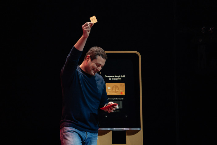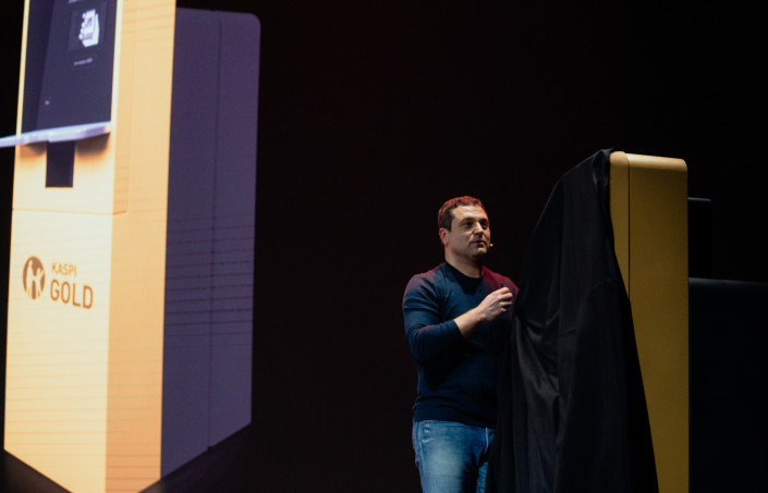 "Наша команда создала совершенно уникальный сервис, когда именная карта Kaspi Gold выпускается на ваших глазах всего за 60 секунд. Дизайн устройства и клиентского опыта сделан командой Kaspi.kz, и само устройство собрано в Казахстане. Мы назвали этот аппарат с любовью - "Kaspi Картомат", - сказал Михаил Ломтадзе и эффектно сдернул ткань с объекта на сцене. Этим объектом оказалось то самое уникальное устройство по производству именной карты Kaspi Gold в режиме реального времени.