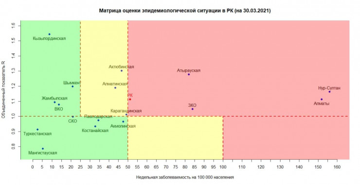 Сообщается, что в "красной" зоне находятся по-прежнему Нур-Султан, Алматы, Атырауская и Западно-Казахстанская области.
