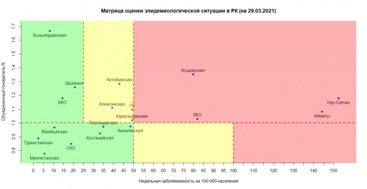 На опубликованной 29 марта матрице оценки эпидемиологической ситуации видно, что Казахстан находится практически на границе "желтой" и "красной" зон. Рядом также уже несколько дней "плавает" Карагандинская область.