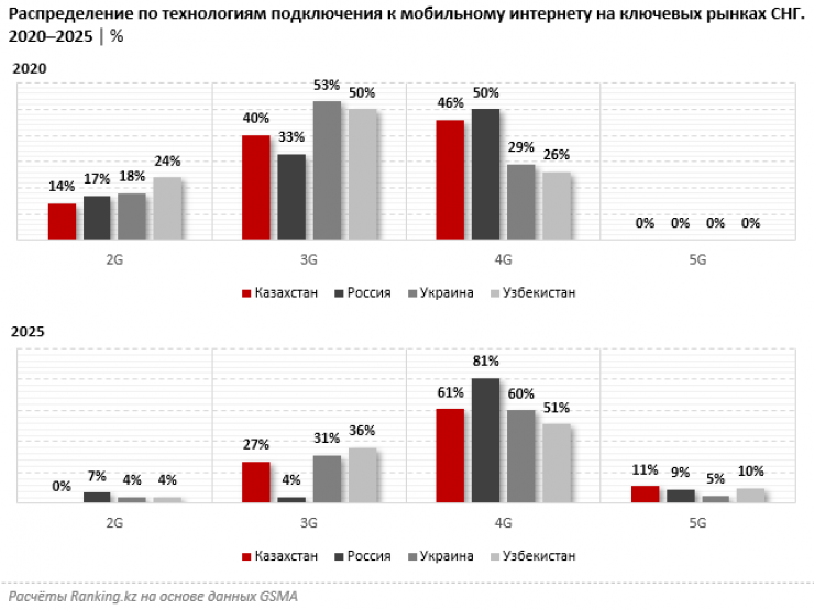 По данным GSMA - организации, которая представляет интересы мобильных операторов, в Казахстане стоимость составляет 11 процентов. В Казахстане технология 5G в 2021 году уже была запущена, официальное тестирование сетей нового поколения начали на территории Алматы.