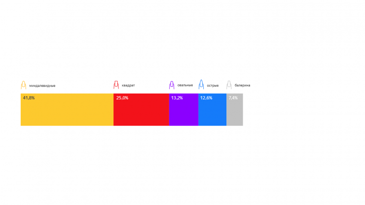 Что касается формы ногтей, то, по данным за прошлый год, самой популярной формой стал "миндаль", на втором месте - квадрат. Острые ногти теряют популярность.
