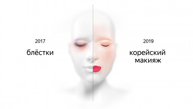 Что касается элементов макияжа, то аналитикам удалось выяснить, что в 2017 году в моду вошли блестки, в 2018-м году - нюд, а в прошлом году - корейский макияж глаз.