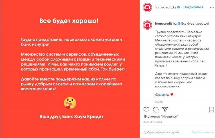 "Все будет хорошо! Трудно представить, насколько сложно устроен банк изнутри! Множество систем и сервисов, объединенных между собой сложными связями и техническими решениями. И мы, как никто, понимаем коллег, у которых произошел временный сбой. Так бывает! Давайте вместе поддержим наших коллег по рынку добрым словом и пожелаем скорейшего восстановления", - написано на официальной странице в Instagram Home Credit Bank.