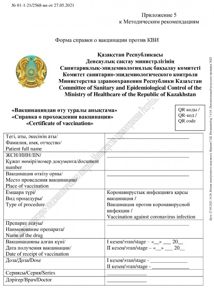 Справка выдана Комитетом санэпидконтроля Минздрава. В ней прописаны: фамилия, имя, отчество, ИИН, место проведения вакцинации, вид процедуры, наименование препарата, даты получения вакцины, дозировка. Данные в документе приводятся на трех языках: казахском, русском и английском.