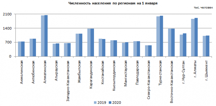 Как отмечается в статистических данных, по сравнению с 1 января 2019 года численность населения увеличилась на 236,5 тысячи человек, или 1,3 процента. За рассматриваемый период наибольший общий прирост наблюдался в трех регионах страны: городе Алматы (62,2 тысячи человек), Нур-Султане (57,6 тысячи человек) и в Туркестанской области (36,4 тысячи человек).