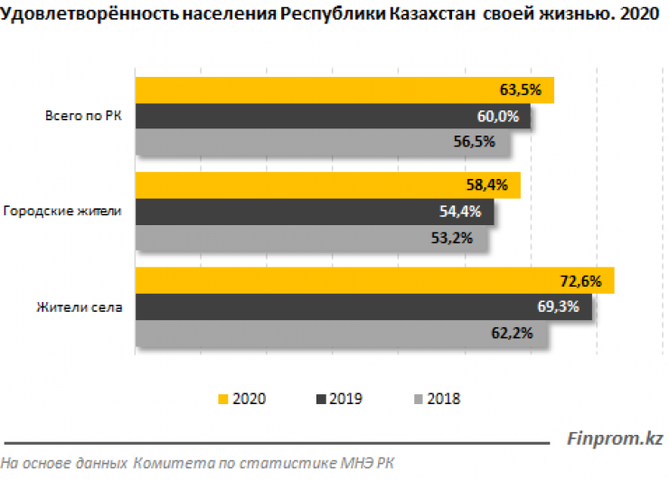 Комитет по статистике МНЭ провел опрос казахстанцев о качестве жизни. По результатам выборочного обследования 63,5 процента респондентов удовлетворены своей жизнью, при этом в сельской местности довольных жизнью казахстанцев значительно больше (72,6 процента), чем в городской (58,4 процента).