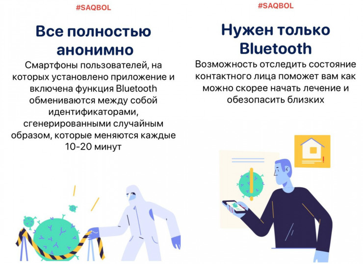 Чтобы воспользоваться приложением Saqbol, требуется скачать его на смартфон и включить функцию Bluetooth, через которую будет производиться передача зашифрованных данных. Приложение доступно на iOS и Android.