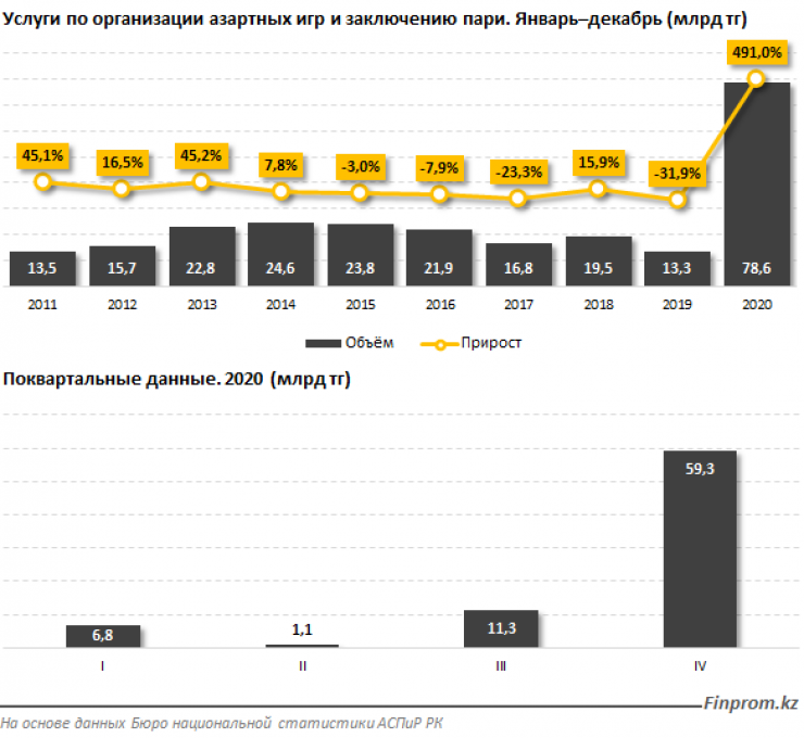 Аналитики подсчитали, что объем услуг по организации азартных игр и заключению пари за 2020 год составил рекордные 78,6 миллиарда тенге. Это почти в шесть раз больше по сравнению с 2019 годом.