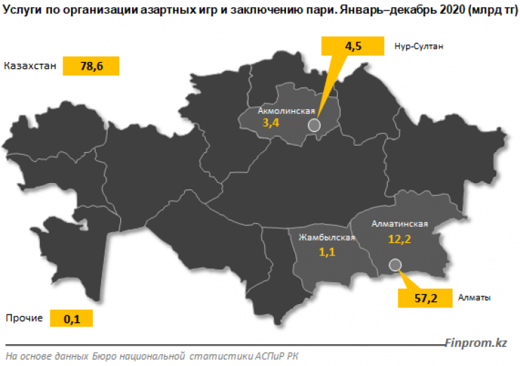 "Следом идет Алматинская область, замыкает топ-3 Нур-Султан. Значительные объемы услуг по организации азартных игр и заключению пари наблюдаются также в Акмолинской и Жамбылской областях. На пятерку регионов-лидеров приходится 99,8 процента от всего объема услуг в этой сфере".