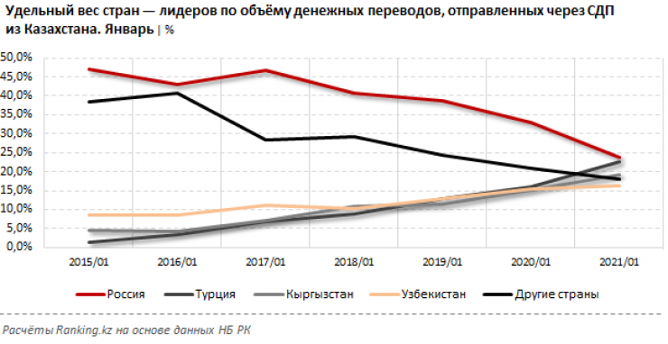 Аналитики пояснили, что удельный вес России как главной страны - получателя денежных переводов из Казахстана сокращается четвертый год. В январе 2017 года доля России составляла 46,6 процента, год назад - 32,8 процента, но уже к январю 2021 года сократилась до всего 23,9 процента.