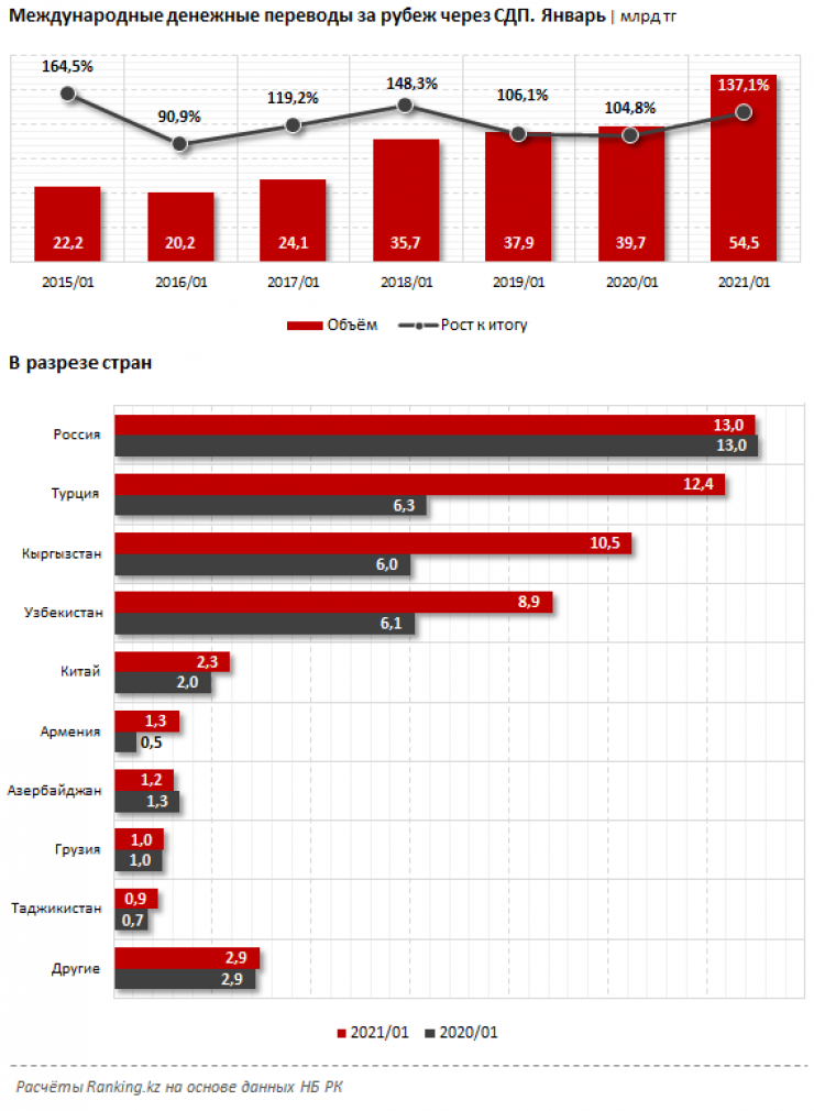 По объему полученных из Казахстана денежных переводов через СДП лидирует Россия, куда в январе отправили 13 миллиардов тенге — на 0,3 процента меньше, чем в прошлом году. Следом идет Турция, куда было отправлено 12,4 миллиарда тенге — почти в 2 раза больше по сравнению с январем 2020 года. Замыкает тройку лидеров Кыргызстан: 10,5 миллиарда тенге — на 75,1 процента больше, чем в прошлом году. Значительный объем денег перевели также в Узбекистан: 8,9 миллиарда тенге, рост за год — на 45,9 процента.