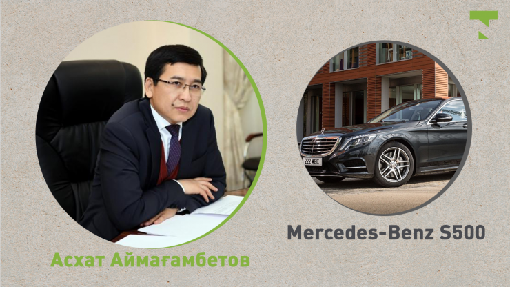 Білім және ғылым министрі Асхат Аймағамбетовтің көлігі - Mercedes-Benz S500. Министрлік баспасөз қызметінің мәліметінше, ведомство басшысының қызметтік көлігі 2014 жылы шығарылған, түсі - қара.