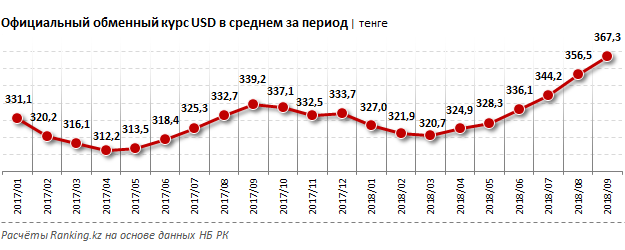 Курс доллара в среднем за сентябрь 2018 года - 367,3 тенге за 1 USD: на 3 процента больше, чем месяцем ранее, и на 8,3 процента больше, чем в сентябре прошлого года.