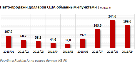 Нетто-продажи доллара обменными пунктами в РК за январь-сентябрь 2018 года составили 999,9 миллиарда тенге.