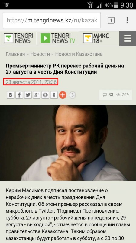 Между тем в социальных сетях и мессенджерах распространяется информация о том, что выходной с субботы, 27 августа, якобы переносится на понедельник, 29 августа. Стоит отметить, что пользователи делятся скриншотами новости, которая вышла пять лет назад 23 августа 2011 года, тогда, действительно, глава правительства Казахстана Карим Масимов подписал постановление о переносе выходного.