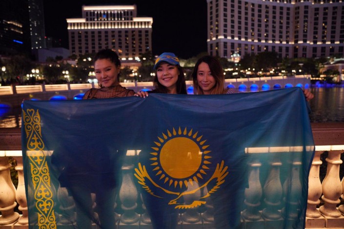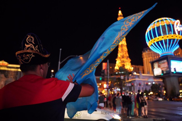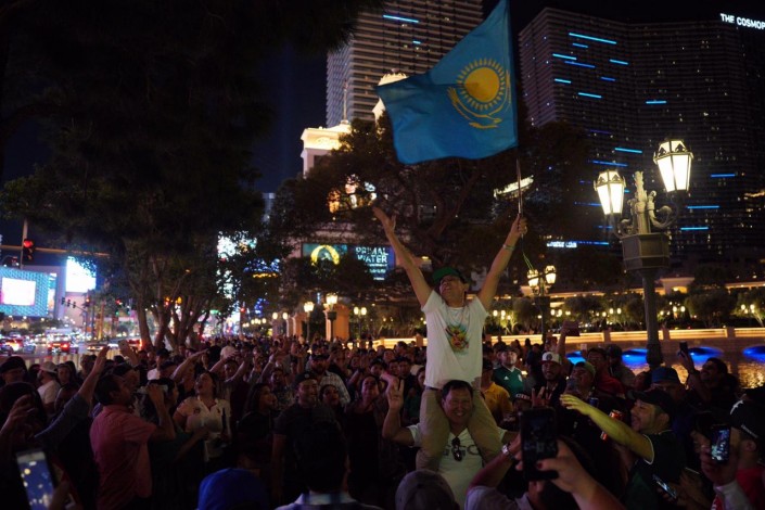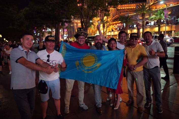 После поражения любимого боксера казахстанцы не впали в уныние. Находящиеся в Лас-Вегасе фанаты Геннадия Головкина поют национальный гимн, размахивают золотисто-голубым флагом и обнимаются с соотечественниками Сауля "Канело" Альвареса.