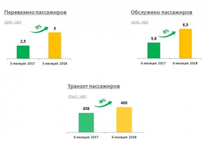 Наблюдается высокий рост количества перевезенных транзитных пассажиров авиакомпаниями. В первом полугодии 2018 года рост в этом сегменте составил 30 процентов (400 тысяч человек) по сравнению с аналогичным показателем 2017 года.