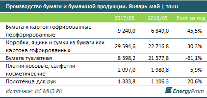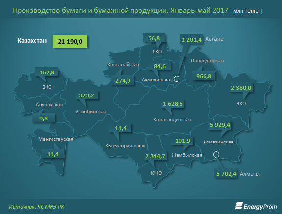 За 5 месяцев бумажная промышленность выпустила продукции на 21,19 миллиарда тенге - рост на 31,9 процента год-к-году. Основные производственные объемы сконцентрированы в Алматинской области,  Алматы и ВКО.