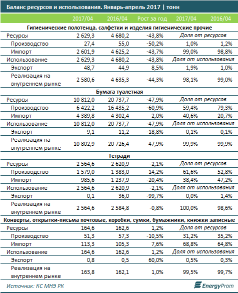 В сегменте гигиенических полотенец, салфеток и прочих бумажных изделий внутренний спрос снизился на 44,3 процента за год, импорт сократился на 43,7 процента. Сегмент остро нуждается в импортозамещении - казахстанские компании могут обеспечить лишь несущественный 1 процент спроса.