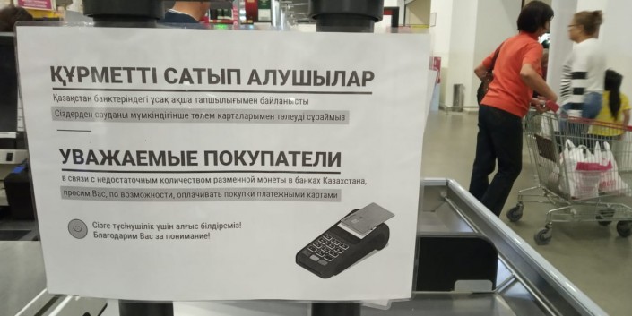 Объявления о нехватке монет появляются в торговых домах Алматы. Администраторы говорят о нехватке монет номиналом от 1 до 100 тенге и просят покупателей расплачиваться банковскими картами.