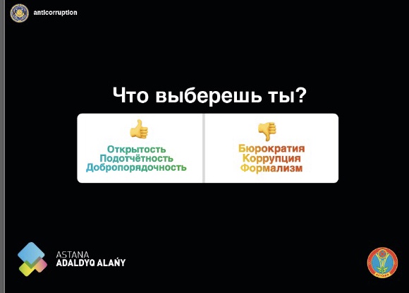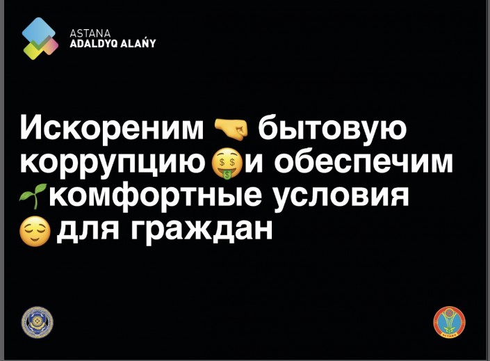 "Для продвижения проекта "Адалдық алаңы" мы запускаем страновую антикоррупционную рекламную кампанию. Дизайн постеров отражает простые и понятные образы сегодняшнего дня. Задумка очень проста - это отсылка к эмодзи, хорошо знакомым нам по использованию мессенджеров", - рассказал на презентации советник председателя Агентства по делам госслужбы и противодействию коррупции Нурлан Жаксымбетов.